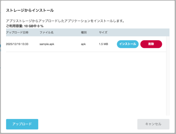 アプリファイルをあらかじめクラウド上の共有ストレージにアップロードしておき、テスト端末に直接インストールできる機能です。