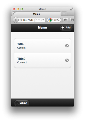 <br /><body><br /><div data-role="page" id="index" data-add-back-btn="false"><br /><%%KEEPWHITESPACE%%> <div data-role="header"><br /><%%KEEPWHITESPACE%%> <h1>Memo</h1><br /><%%KEEPWHITESPACE%%> <a href="#add" class="ui-btn-right" data-icon="plus">Add</a><br /><%%KEEPWHITESPACE%%> </div><br /><br /><%%KEEPWHITESPACE%%> <div data-role="content"><br /><%%KEEPWHITESPACE%%> <ul id="memolist" data-role="listview" data-inset="true"><br /><%%KEEPWHITESPACE%%> <li><a><h2>Title</h2><p>Content</p></a></li><br /><%%KEEPWHITESPACE%%> <li><a><h2>Title2</h2><p>Content2</p></a></li><br /><%%KEEPWHITESPACE%%> </ul><br /><%%KEEPWHITESPACE%%> </div><br /><br /><%%KEEPWHITESPACE%%> <div data-role="footer" class="ui-bar" data-position="fixed"><br /><%%KEEPWHITESPACE%%> <a href="#info-dialog" data-icon="info" data-rel="dialog">About</a><br /><%%KEEPWHITESPACE%%> </div><br /></div><br /><br /><div data-role="page" id="add"><br /><%%KEEPWHITESPACE%%> <div data-role="header"><br /><%%KEEPWHITESPACE%%> <h1>Memo Add</h1><br /><%%KEEPWHITESPACE%%> <a href="#add" class="ui-btn-right" data-icon="plus">Add</a><br /><%%KEEPWHITESPACE%%> </div><br /><br /><%%KEEPWHITESPACE%%> <div data-role="content"><br /><%%KEEPWHITESPACE%%> <div data-role="filedcontain"><br /><%%KEEPWHITESPACE%%> <fieldset data-role="controlgroup"><br /><%%KEEPWHITESPACE%%> <legend>Memo</legend><br /><%%KEEPWHITESPACE%%> <input type="text" id="add-title" placeholder="Title"/><br /><%%KEEPWHITESPACE%%> <textarea id="add-content" placeholder="Content"></textarea><br /><%%KEEPWHITESPACE%%> </fieldset><br /><%%KEEPWHITESPACE%%> </div><br /><%%KEEPWHITESPACE%%> </div><br /><br /><%%KEEPWHITESPACE%%> <div data-role="footer" class="ui-bar" data-position="fixed"><br /><%%KEEPWHITESPACE%%> <a href="#" data-icon="check" id="save-addbtn">Save</a><br /><%%KEEPWHITESPACE%%> </div><br /></div><br />(略)<br />