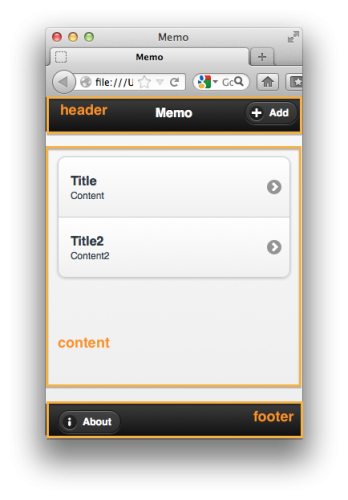 そして、header、content、footerの各部分は、data-roleをheader、content、footerに指定したdivダグを作って定義します。