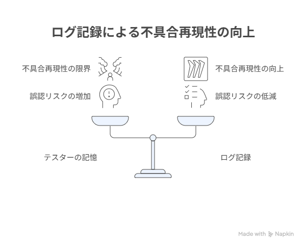 こうした“運まかせ”で非効率な作業を変えるためには、テスターがどのような操作をしたかの証跡を記録する「ログ」を残しておくことが重要です。ログを残すことで、なぜその不具合が発生したのか、その原因が追えるため、“運まかせ”でテストを振り返るよりも、効率的に作業を行うことができます。