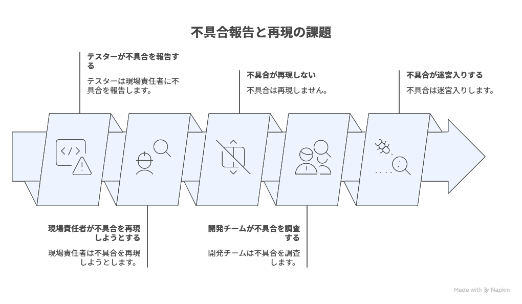 こうした状況に陥ると、開発チームはもう一度不具合が出るまで、考えられるさまざまなパターンを試すことになります。仮に不具合を再現できず、「迷宮入り」したままアプリをリリースしてしまうと、リリース後に大きなトラブルに繋がってしまう恐れがあります。現場責任者は、何とかして不具合が起きたとされる状況を再現しようと躍起になり、それが大きな負担となっています。