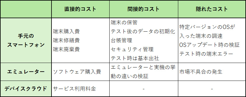 先に挙げた「①手元のスマートフォン」「②エミュレーター」「③デバイスクラウド」の3つの実行環境のうち、最も「真のコスト」が安く済むのはどれなのでしょうか?以下に比較してみます。